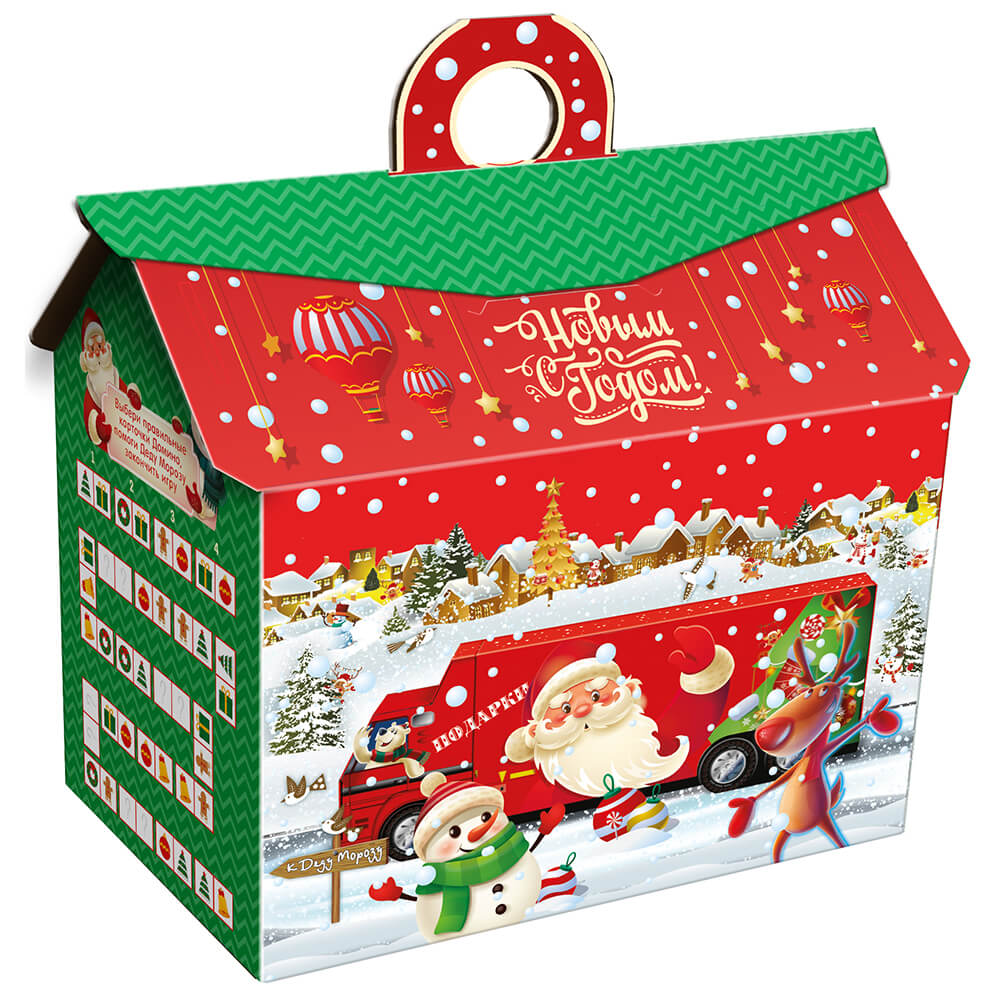 Коробка в виде домика в красивом рождественском оформлении в красно-зеленом цвете, и задания на логику и внимание, лабиринт-бродилка.