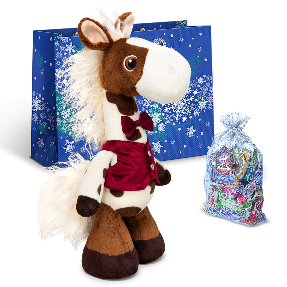 Набор Мэйс в новогоднем пакете с мягкой игрушкой символом наступающего 2026 года и мешочком со сладким подарком 800г Стандарт.