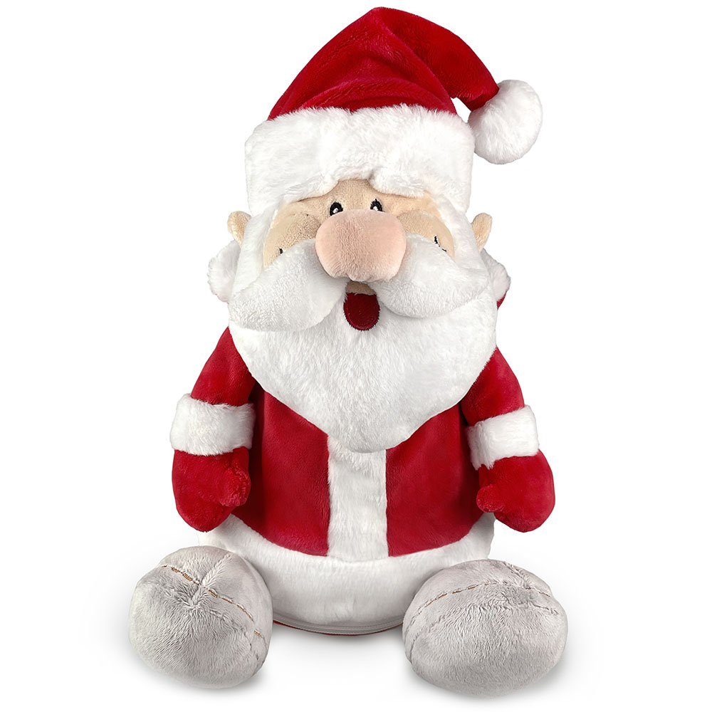 Широко улыбающийся Дедушка Мороз с густой бородой, в классическом костюме с отделкой из белоснежного меха — красный кафтан с воротником, шапочка с помпоном, варежки и валенки. Глаза и улыбка сделаны вышивкой.