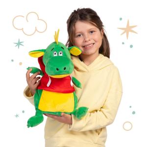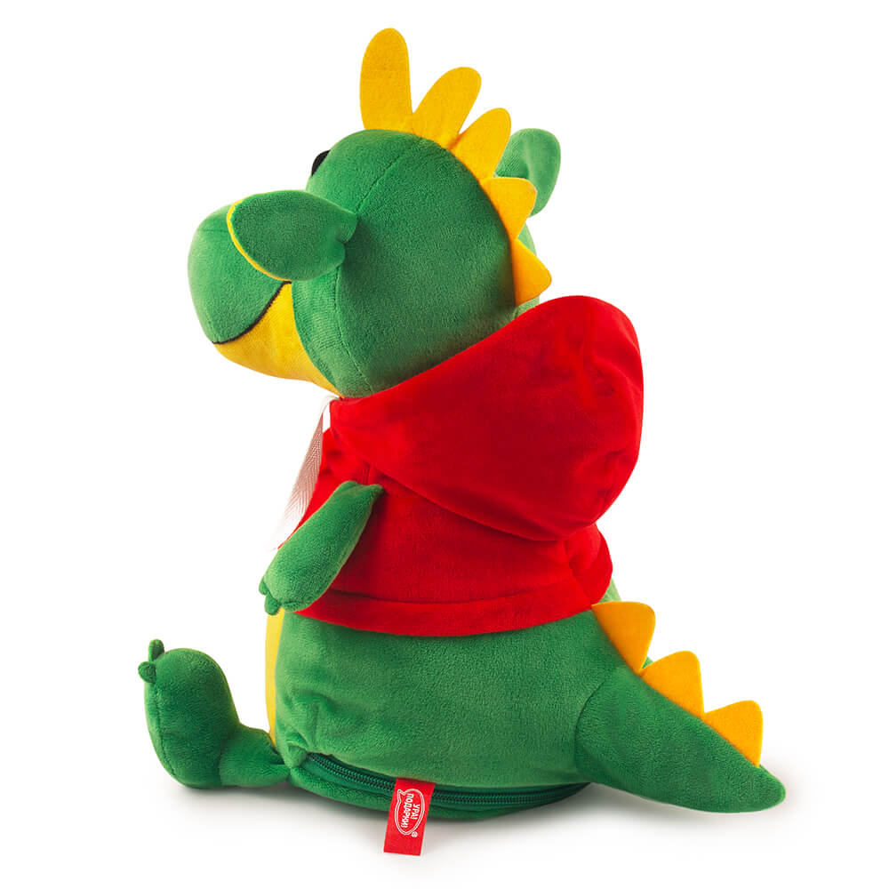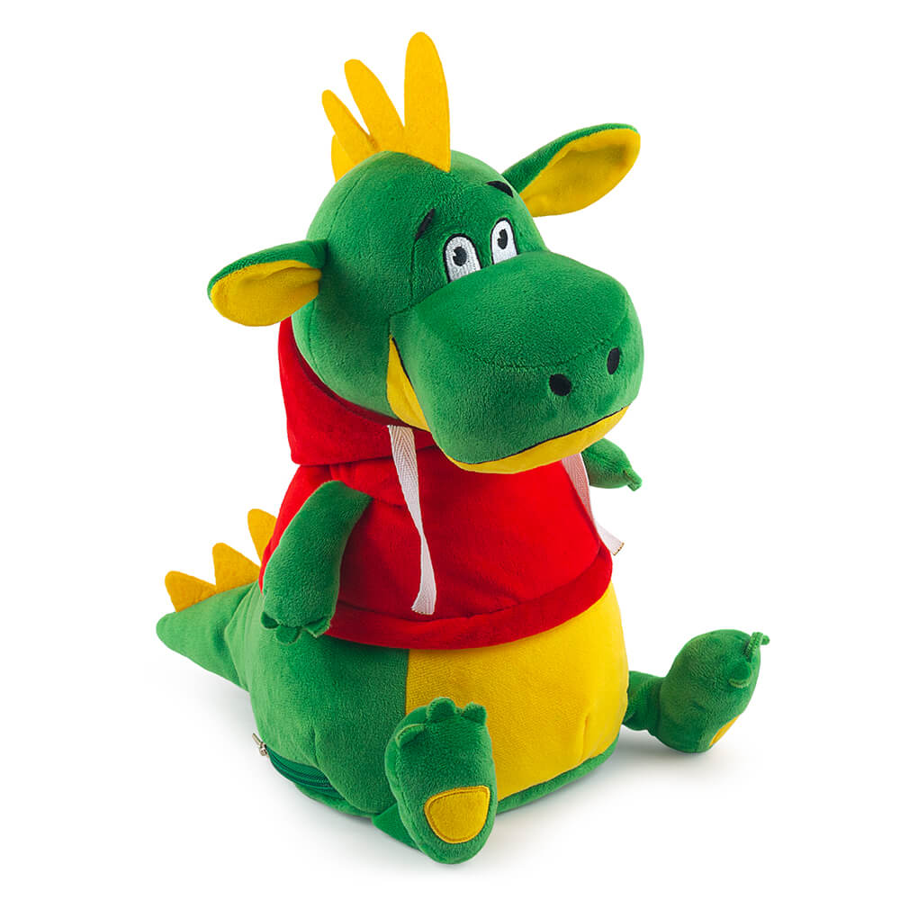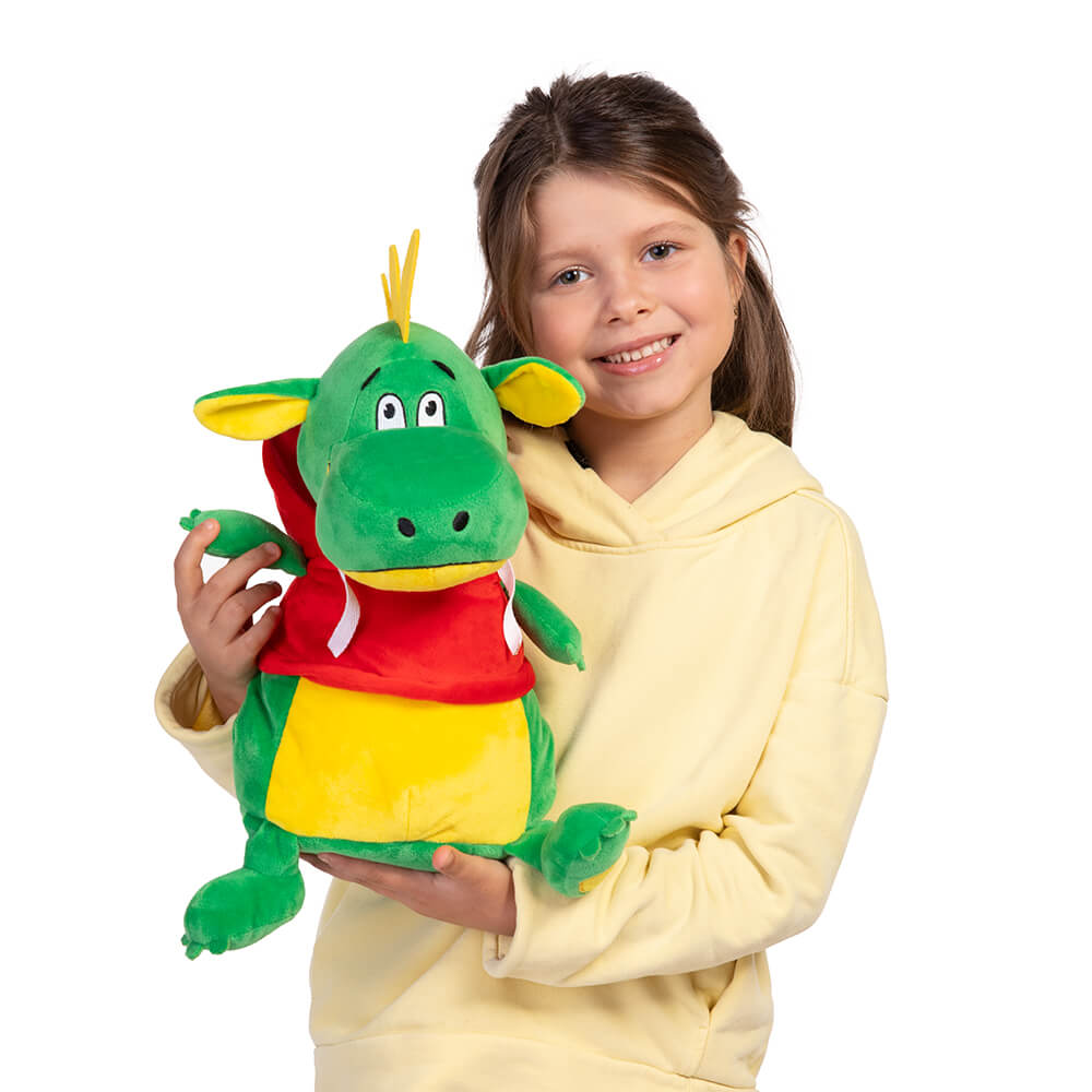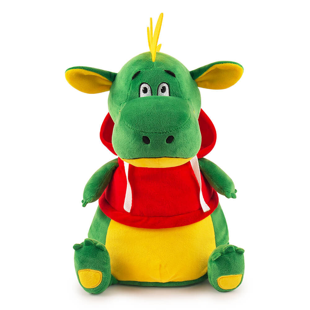 Текстильная игрушка дракон Морис в красной толстовке с капюшоном. Выполнен из плюша насыщенного зеленого цвета, с ярко‑желтыми ушками, мордочкой и брюшком. Гребень по спинке из плотного фетра также желтого цвета.