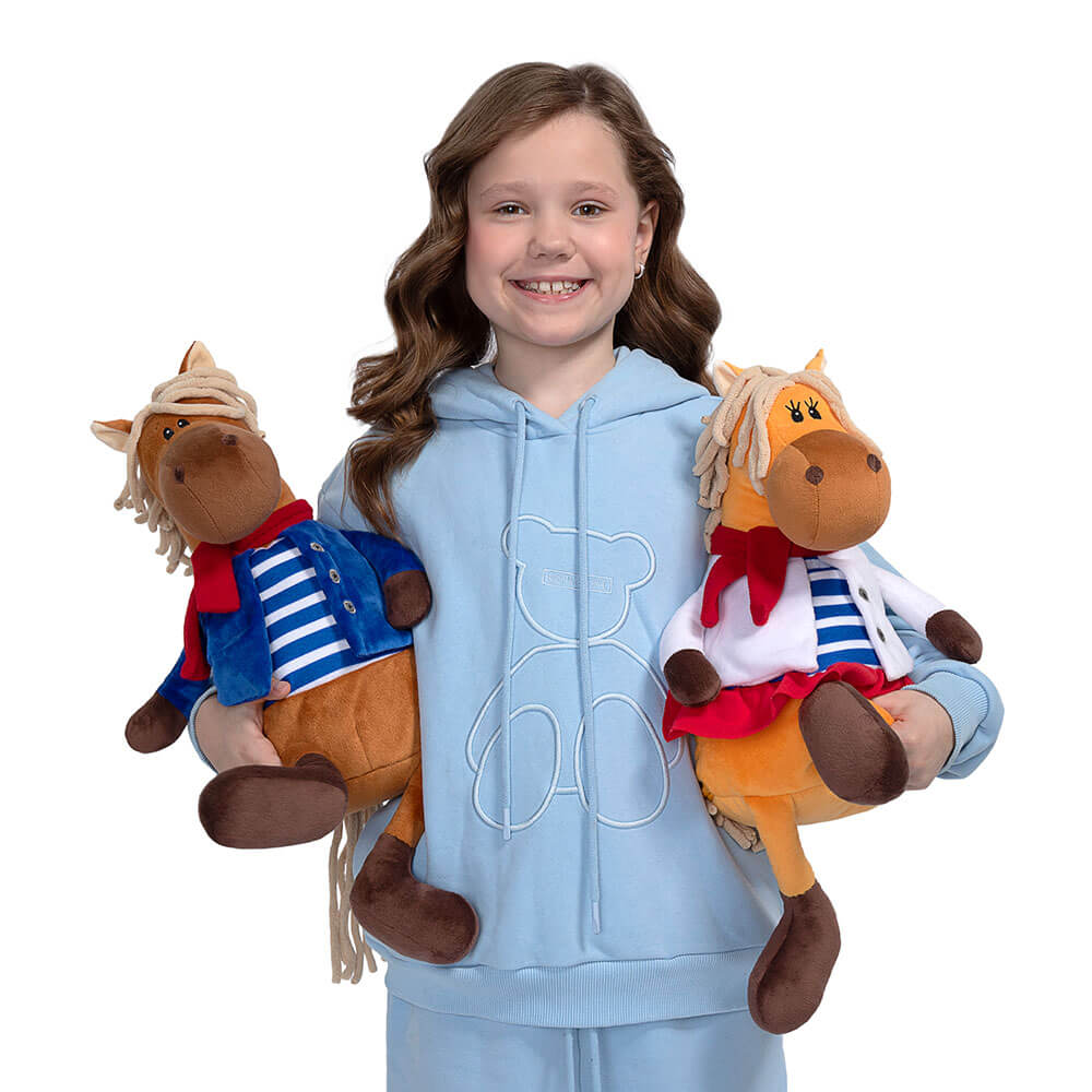 Новогодний подарок Лошадь Бьянка сшита из мягкого софта оранжевого цвета. У нее полосатая футболка с белой рубашкой, также красный шарф, который элегантно перевязан. Внутри мягкой игрушки потайной карман на молнии со сладким подарком. Набор конфет 600г Стандарт.