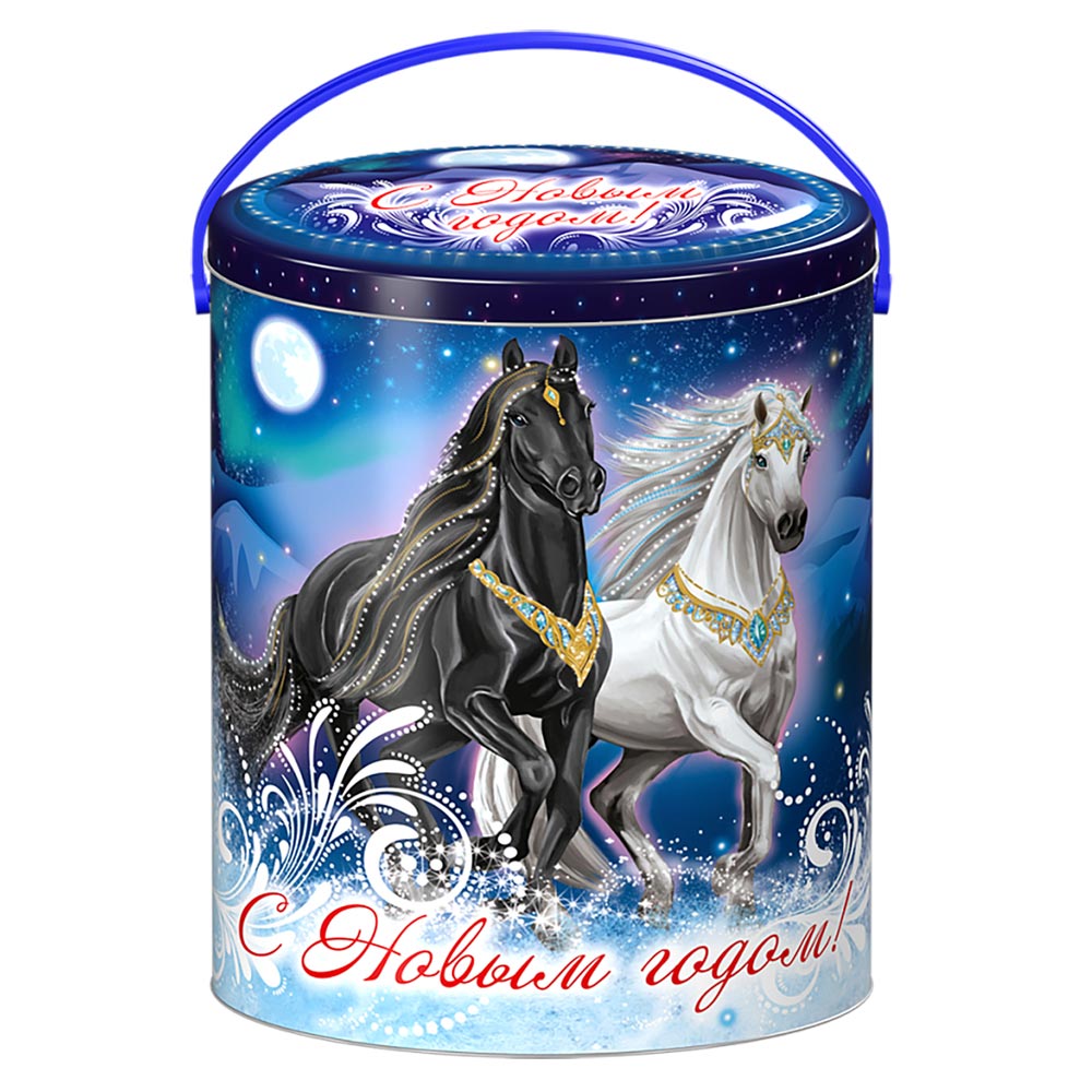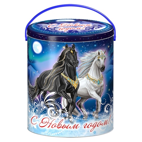 На упаковке изображена пара лошадей, черного и белого цвета. Символ Наступающего 2026 года. На обратной стороне часы-куранты и надпись "С Новым годом!"