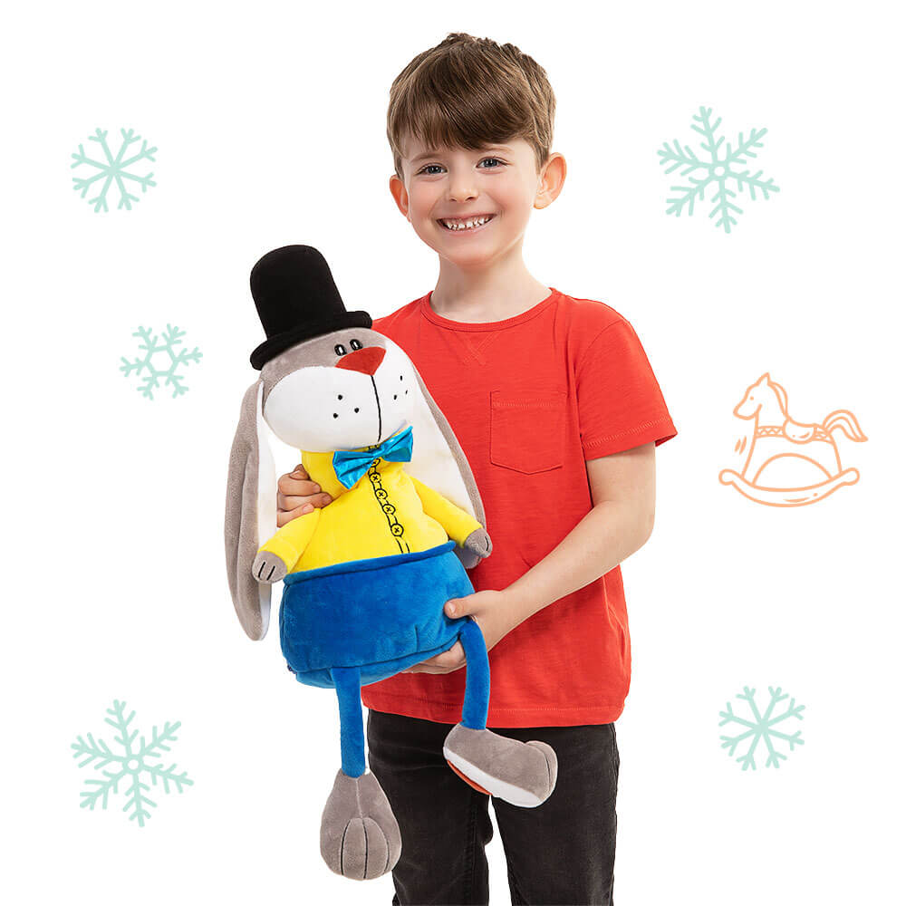 Текстильная упаковка игрушка заяц Чарльз в нарядном костюмчике и черной шляпе.